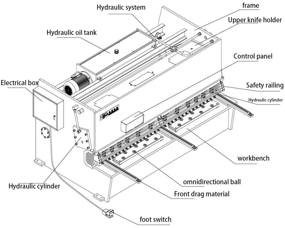 2. A hydraulic pressing mechanism is used. After oil is supplied to several pressing cylinders mounted on the support plate at the front of the machine frame, the pressing head presses down against the tension of the spring, clamping the sheet material. After shearing, it returns to its original position by the tension of the spring. The magnitude of the pressing force increases with the increase of the thickness of the sheet being sheared.